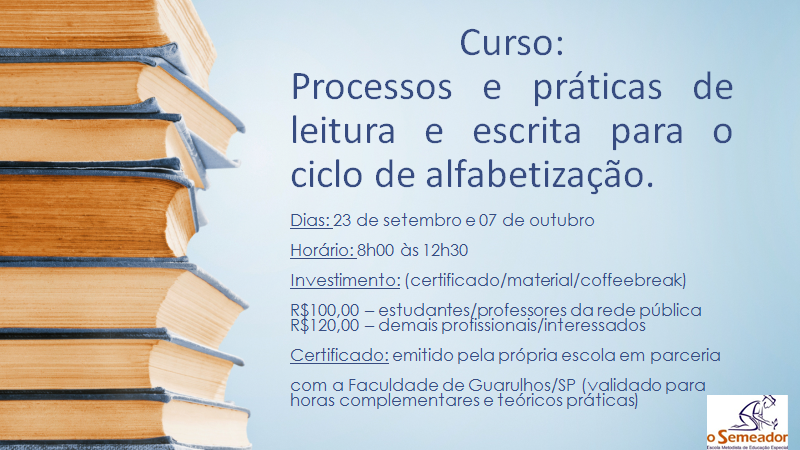30/08/2017Curso: Processos e práticas de leitura e escrita para o ciclo de alfabetização Emei, Emi, Creche, Emef - Comunicado 1499/2025> Segue informações sobre o Curso: Processos e práticas de leitura e escrita para o ciclo de alfabetização Favor divulgar. ESCOLA METODISTA DE EDUCAÇÃO ESPECIAL "O SEMEADOR" - AMAS Rua dos Meninos, 555 Bairro Mauá - São Caetano do Sul - SP Cep: 09580-300 Telefones: 4238-3100/4232-9511 Site: www.escolaosemeador.com.br Face: Escola Metodista O Semeador - Clique aqui para acessar o documento anexo