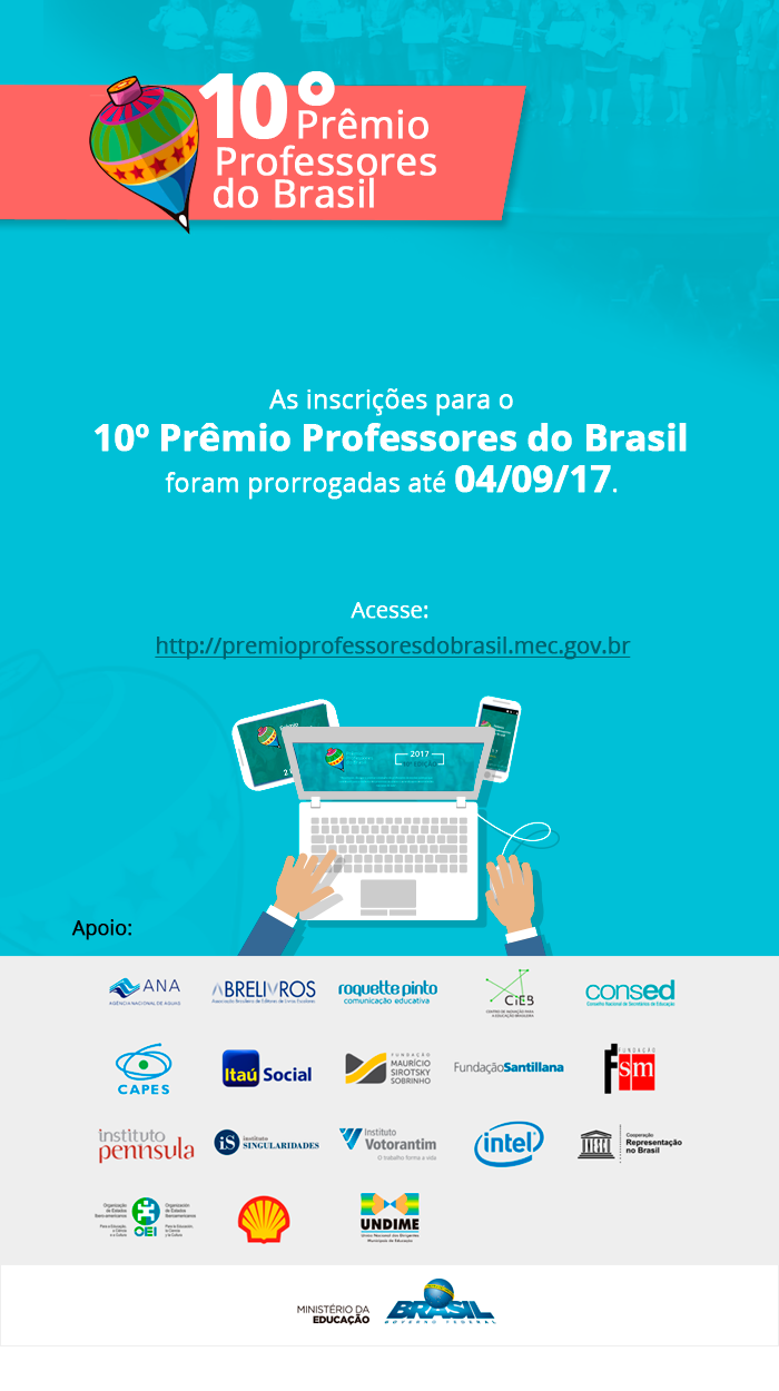 30/08/2017Prorrogado - 10º prêmio Professores do Brasil Emei, Emi, Creche, Emef, Complementares - Comunicado 1500/2025> A inscrição que era até o dia 25/08 foi prorrogada para até 4/09. Escrita de um relato de prática pedagógica via site - http://premioprofessoresdobrasil.mec.gov.br/ Apenas poderão ser inscritos relatos de prática docente com resultados comprovados durante o ano letivo de 2016 ou 2017 até final do período de inscrições, que será o dia 4/09/17. Não podem concorrer: Práticas pedagógicas premiadas em edições anteriores (ou que já tenham sido publicados em outros meios) - Clique aqui para acessar o documento anexo - Para maiores informações Quaisquer dúvidas, entrar em contato:Vilson ou Carina - 42242400