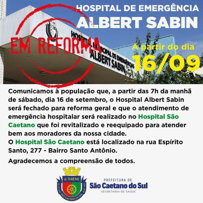 13/09/2017Importante - Hospital de Emergência Albert Sabin Emei, Emi, Creche, Emef, Complementares - Comunicado 1511/2025> Comunicamos à população que, a partir das 7h da manhã de sábado, dia 16 de setembro, o Hospital Albert Sabin será fechado para reforma geral e que o atendimento de emergência hospitalar será realizado no Hospital São Caetano que foi revitalizado e reequipado para atender bem aos moradores de nossa cidade. O Hospital São Caetano está localizado na rua Espírito Santo, 277 - Bairro Santo Antônio. Agradecemos a compreensão de todos. Secretaria de Saúde. Clique aqui para acessar o documento anexo