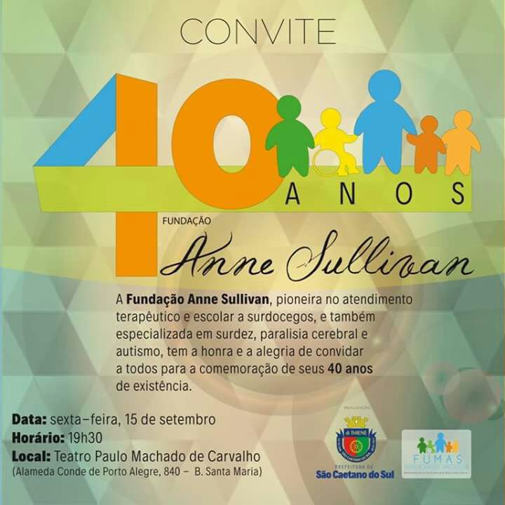 06/09/2017Convite 40 anos Fundação Anne Sullivan Emei, Emi, Creche, Emef, Complementares - Comunicado 1508/2025> Convidamos a todos prestigiar o evento. - Clique aqui para acessar o documento anexo