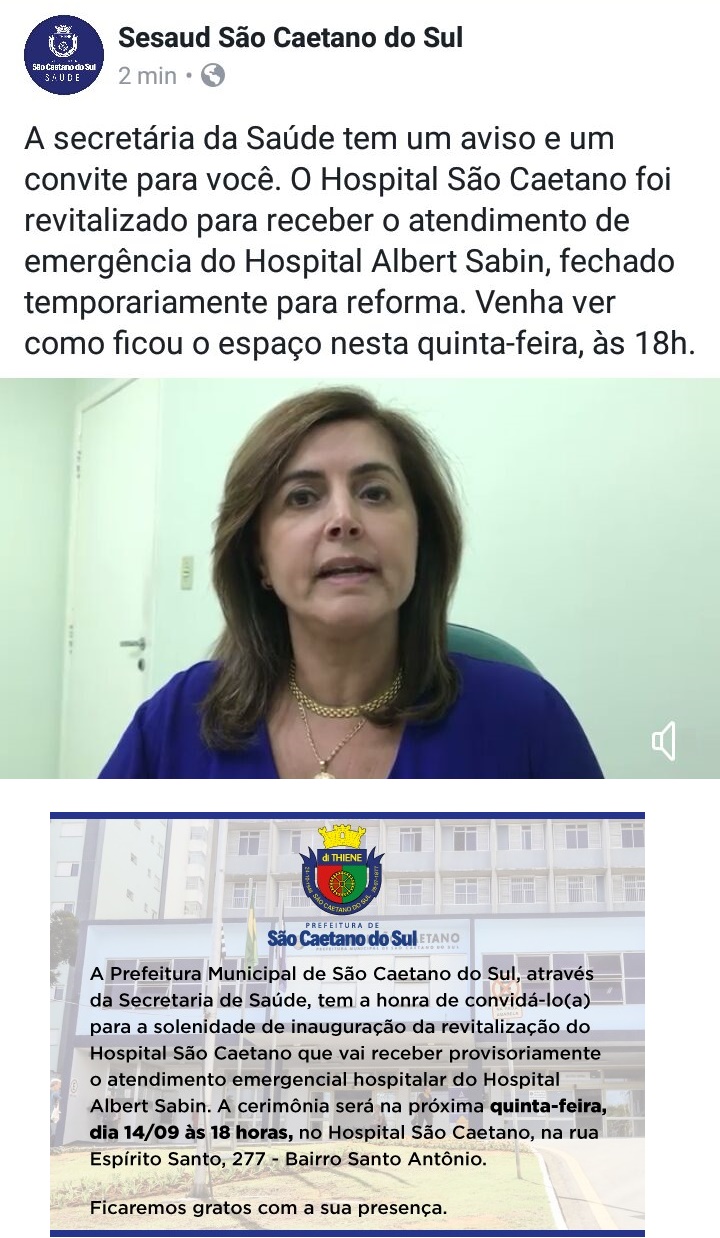 14/09/2017Convite Secretaria de Saúde Emei, Emi, Creche, Emef, Complementares - Comunicado 1515/2025> A Prefeitura Municipal de São Caetano do Sul, através da Secretária de Saúde, tem a honra de convidá-lo(a) para a solenidade de inauguração da revitalização do Hospital São Caetano, que vai receber provisoriamente o atendimento emergencial hospitalar do Hospital Albert Sabin. A cerimônia será na próxima quinta-feira, dia 14/09, às 18 horas, no Hospital São Caetano, na rua Espírito Santo, 277 - Bairro Santo Antônio. Ficaremos gratos com sua presença.