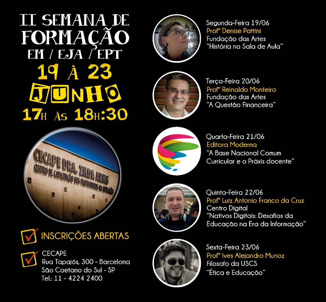 19/06/2017ERRATA - Semana de Formação - Divulgação nº 1431 Emei, Emi, Creche, Emef, Complementares - Comunicado 1437/2025> A divulgação Nº 1431 acabou sendo publicada com informação incompleta, sendo solicitado, como transcrito abaixo, a sua correção: "Solicito que a divulgação sobre a semana de formação seja complementada para “2ª Semana de Formação do Ensino Médio, EPT e EJA”, para evitar dúvidas das escolas do infantil, segue anexo o novo folder." - Clique aqui para acessar o documento anexo - Quaisquer dúvidas, entrar em contato:Yara Rosa Santana - 4224-2400