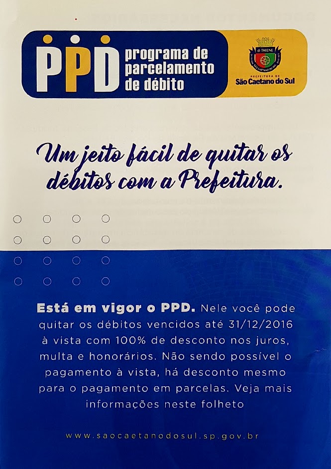 17/07/2017PPD - Programa de Parcelamento Emei, Emi, Creche, Emef, Complementares - Comunicado 1457/2025> Está em vigor o PPD. com ele o munícipe pode quitar os débitos vencidos até 31/12/2016 à vista com 100% de desconto nos juros, multa e honorários. Não sendo possível o pagamento à vista, há desconto mesmo para o pagamento em até 48 parcelas. Divulguem essa informação, pois é um jeito fácil de quitar os débitos com a Prefeitura!!! Procure o Atende Fácil ou Acesse o site www.saocaetanodosul.sp.gov.br Quaisquer dúvidas, entrar em contato:Vanda - 42327199