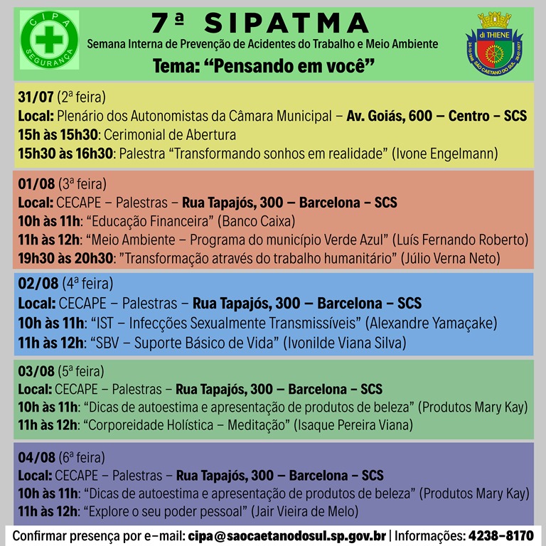 24/07/2017São Caetano 140 Anos: Programação de festejos da cidade começa nesta sexta-feira Emei, Emi, Creche, Emef, Complementares - Comunicado 1467/2025> No próximo 28 de julho, São Caetano do Sul completa 140 anos de sua fundação. A comemoração se inicia com imagens históricas do município, por meio da exposição fotográfica “Nossa História”. A programação segue até agosto com atrações tradicionais como a Festa Italiana, Missa Campal e Bolo de Aniversário, além de outras atrações. Confira: Aniversário de 140 anos de São Caetano do Sul - Programação de Festejos JULHO DIA 14/07 – 11h ABERTURA DA EXPOSIÇÃO IMAGENS DA NOSSA HISTÓRIA LOCAL : ATENDE FÁCIL – RUA MAJOR CARLO DEL PRETE, 651 – CENTRO DIA 14/07 – 18h VI CONFERÊNCIA MUNICIPAL DE SAÚDE LOCAL: CAMPUS BARCELONA - USCS - AVENIDA GOIÁS, 3.400 DIA 19/07 – 19h ABERTURA DA EXPOSIÇÃO: CONTRASTES: KIN-I-CHI KANECO E BIA DORIA LOCAL : PINACOTECA MUNICIPAL – AV. DR. AUGUSTO DE TOLEDO, 255 - BAIRRO SANTA PAULA DIA 22/07 – DAS 7h ÀS 22h CAMPEONATO DE CROSSFIT NO ABREVB L OCAL: AV. PRESIDENTE KENNEDY, 2300 - BAIRRO OLÍMPICO DIA 22/07 – 11h ABERTURA DA EXPOSIÇÃO FOTOGRÁFICA: ITÁLIA EM 40 CLICKS LOCAL: MUSEU HISTÓRICO MUNICIPAL – R. MAXIMILIANO LORENZINI, 122 – B. FUNDAÇÃO DIA 23/07 – 10h30 PROCISSÃO DE SÃO CRISTÓVÃO LOCAL: SAÍDA DA IGREJA MATRIZ SÃO CAETANO – BAIRRO FUNDAÇÃO (ATÉ A PARÓQUIA SAGRADO CORAÇÃO DE JESUS, NO BAIRRO SÃO JOSÉ) DIA 23/07 – 9h E 10h30 FINAIS DE FUTEBOL AMADOR - ESTÁDIO ANACLETO CAMPANELLA - AV. WALTER THOMÉ, 64 - BAIRRO OLÍMPICO DIA 25/07 – 19h SESSÃO SOLENE 140º ANIVERSÁRIO DA CIDADE LOCAL – PLENÁRIO DOS AUTONOMISTAS – AV. GOIÁS, 600 - CENTRO DIA 25 A 29/07 PROGRAMA BAIRRO A BAIRRO – FUNDAÇÃO Bota-Fora de Entulhos - de 25 a 28/7 - das 7h às 17h Gente Cuidando de Gente - 26/7 (das 15h às 21h) e 29/7 (das 9h às 13h) Audiência Pública - 27/7 às 18h30 na página Bairro a Bairro no Facebook Cidadão da História - 28/7 às 19h30 - Igreja Presbiteriana - rua Heloísa Pamplona, 177 Intensivão de Serviços - 29/7 (das 9h às 13h) na rua Dr. Rodrigues Alves DIA 26/07 – 19h30 INAUGURAÇÃO DA QUADRA DO GISELA LOCAL: GISELA - RUA SEBASTIÃO DIOGO, 99 - BAIRRO BOA VISTA DIA 27/07 – 19h30 CULTO EVANGÉLICO EM COMEMORAÇÃO AO ANIVERSÁRIO DA CIDADE LOCAL: TEATRO PAULO MACHADO DE CARVALHO – BAIRRO SANTA MARIA DIA 28/07 – 10h MISSA CAMPAL E BOLO DE ANIVERSÁRIO DE 140 ANOS LOCAL: PRAÇA ERMELINO MATARAZZO - BAIRRO FUNDAÇÃO DIAS 28, 29 E 30/07 – DAS 8h às 22h EXPOSIÇÃO DE CARROS ANTIGOS LOCAL: ESPAÇO VERDE CHICO MENDES - BAIRRO CERÂMICA DIA 29/07 – 9h às 17h EVENTO A RUA É SUA. Parceria com a Rede Globo. LOCAL: AV. FERNANDO SIMONSEN – EM FRENTE AO CHICO MENDES – BAIRRO CERÂMICA DIA 29/07 – 20h BAILE DE ANIVERSÁRIO DA CIDADE E ANIVERSARIANTES DO MÊS LOCAL: CISE JOÃO NICOLAU BRAIDO - R. HUMBERTO DE CAMPOS, 600 DIA 30/07 – 9h CAMINHADA DE ANIVERSÁRIO DA CIDADE SAÍDA: ESTACIONAMENTO DO HIPERMERCADO EXTRA – AV. GOIÁS COM AV. GUIDO ALIBERTI DIA 30/07 – 10h30 ENTREGA DA MEDALHA di THIENE LOCAL: SALÃO NOBRE DA CÂMARA MUNICIPAL – CENTRO AGOSTO DIA 03/08 – 19h ATO SOLENE EM HOMENAGEM AO EX-ATLETA ROGÉRIO SAMPAIO LOCAL: PLENÁRIO DOS AUTONOMISTAS – AV. GOIÁS, 600 – CENTRO DIAS 03/08 e 04/08 – 20h PEÇA TEATRAL O SOM E A SÍLABA DIREÇÃO: MIGUEL FALABELLA ELENCO: ALESSANDRA MAESTRINI e MIRNA RUBIN LOCAL: TEATRO PAULO MACHADO DE CARVALHO – BAIRRO SANTA MARIA DIA 05/08 - Atrações musicais evangélicas (10h) - Cerimônia (11h30) INAUGURAÇÃO DA PRAÇA DA BÍBLIA LOCAL: AVENIDA GOIÁS - CENTRO DIA 05/08 – DAS 13h ÀS 18h FEIJOADA DO BEM LOCAL: CISE JOÃO NICOLAU BRAIDO - BAIRRO SÃO JOSÉ DE 05 A 27/08 - SÁBADOS E DOMINGOS - a partir das 18h 25ª FESTA ITALIANA LOCAL: PRAÇA ERMELINO MATARAZZO - BAIRRO FUNDAÇÃO DIA 11/08 – 12h ALMOÇO EM COMEMORAÇÃO AO ANIVERSÁRIO DA CIDADE E DO CISE FRANCISCO CORIOLANO DE SOUZA LOCAL: NO PRÓPRIO CISE, RUA DIONÍZIO MERCADO, 199 - BAIRRO NOVA GERTY DIA 13/08 - 10h CÃOMINHADA DAS ONGs LOCAL: AV. KENNEDY - RUA DE LAZER DIA 17/08 – 19h CONCURSO DE MISS E MISTER DA 3ª IDADE LOCAL: CISE JOÃO NICOLAU BRAIDO - BAIRRO SÃO JOSÉ DIA 20/08 - 10h ZUMBA MASTER LOCAL: GINÁSIO POLIESPORTIVO MILTON FEIJÃ0 - AV. WALTER THOMÉ, 64 - BAIRRO OLÍMPICO DIA 20/08 - 12h ALMOÇO DANÇANTE EM COMEMORAÇÃO AO ANIVERSÁRIO DA CIDADE LOCAL: CISE MOACYR RODRIGUES - R. RAFAEL CORRÊA SAMPAIO, 600 – B. SANTO ANTÔNIO DIA 22/08 - 19h30 LANÇAMENTO DA REVISTA RAÍZES Nº 55 LOCAL: TEATRO SANTOS DUMONT - AVENIDA GOIÁS, 1.111 - BAIRRO SANTA PAULA DIA 25/08 - 19h30 DIA DO SOLDADO, COM SARGENTO LEAL LOCAL: ESPAÇO VERDE CHICO MENDES - BAIRRO CERÂMICA DIA 31/08 - 19h EVENTO: PEQUENO GRANDE EMPREENDEDOR LOCAL: ASSOCIAÇÃO COMERCIAL E INDUSTRIAL DE SÃO CAETANO DO SUL - ACISCS - RUA AMAZONAS, 318 - CENTRO DIA 01/09 - 12h ALMOÇO EM COMEMORAÇÃO AO ANIVERSÁRIO DO CISE JOÃO CASTALDELLI LOCAL: NO PRÓPRIO CISE - AV. PRESIDENTE KENNEDY, 2.400 - SANTA PAULA Quaisquer dúvidas, entrar em contato:Imprensa - 4233-7480