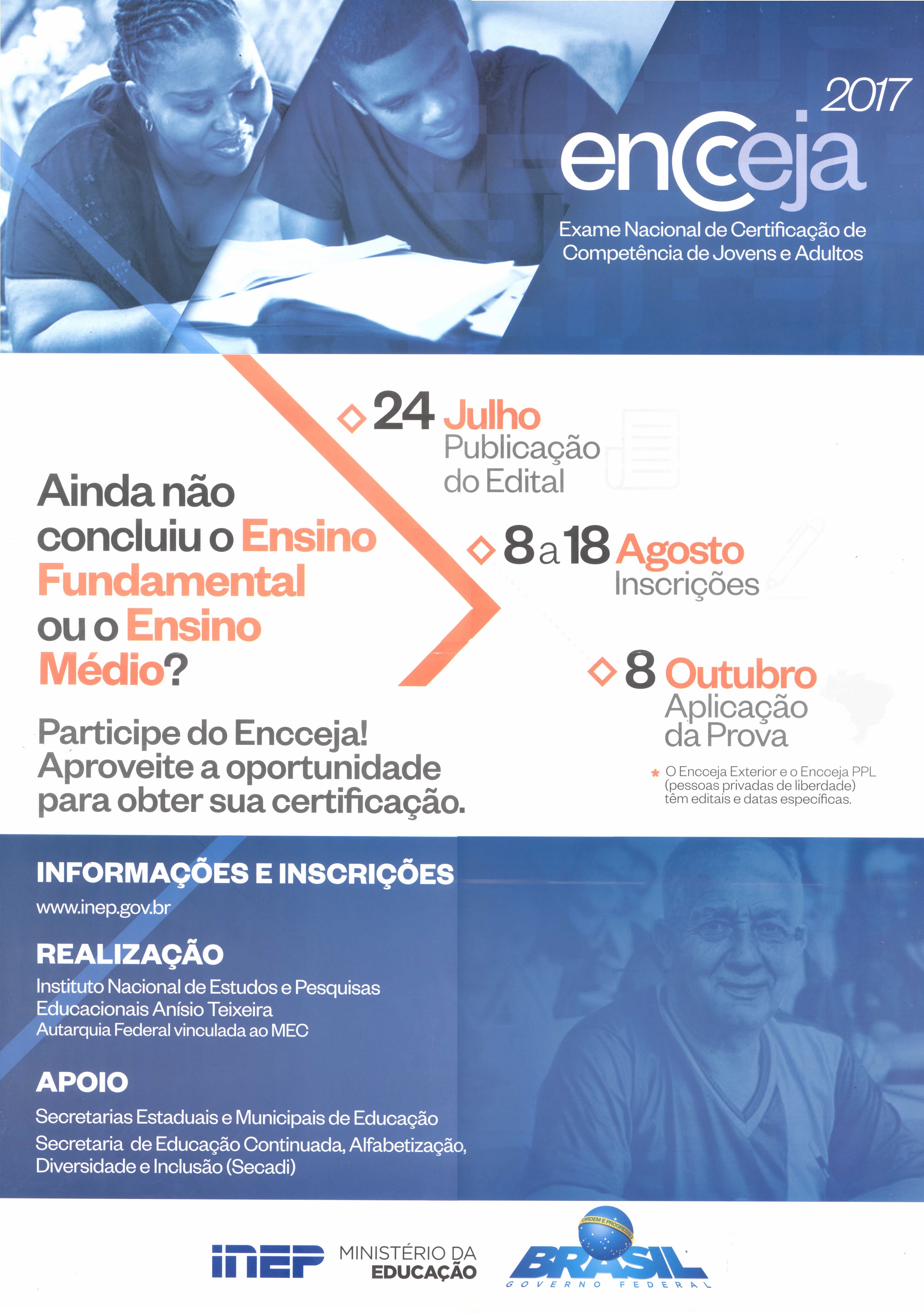 21/07/2017Encceja 2017 - Exame Nacional de Certificação de Competência de Jovens e Adultos Emei, Emi, Creche, Emef, Complementares - Comunicado 1465/2025> Você conhece alguém que ainda não concluiu o Ensino Fundamental ou o Ensino Médio? DIVULGUE O Encceja !!!! Assim eles não perderão a oportunidade para obter sua certificação. O Instituto Nacional de Estudos e Pesquisas Educacionais Anísio Teixeira, Autarquia vinculada ao Ministério da Educação, irá realizar uma prova em nível nacional, para a certificação de competências da educação de jovens e adultos (Encceja). Até o ano de 2016, o Encceja vinha sendo aplicado, unicamente, aos brasileiros residentes no exterior. A certificação do Ensino Médio, aos participantes do Brasil, era realizada por meio do Enem e a certificação do Ensino Fundamental encontrava-se suspensa desde o ano de 2014. Neste sentido, queremos contar com o apoio de todos para na divulgação da realização do Encceja, visando sensibilizar ao público alvo do Exame para minimizar a abstenção dos participantes. * 24 de Julho - publicação do Edital; * 8 a 18 de Agosto - Inscrições; * 8 de Outubro - Aplicação da Prova. Informações e Inscrições: www.inep.gov.br Quaisquer dúvidas, entrar em contato:Maria Cristina - 42327199