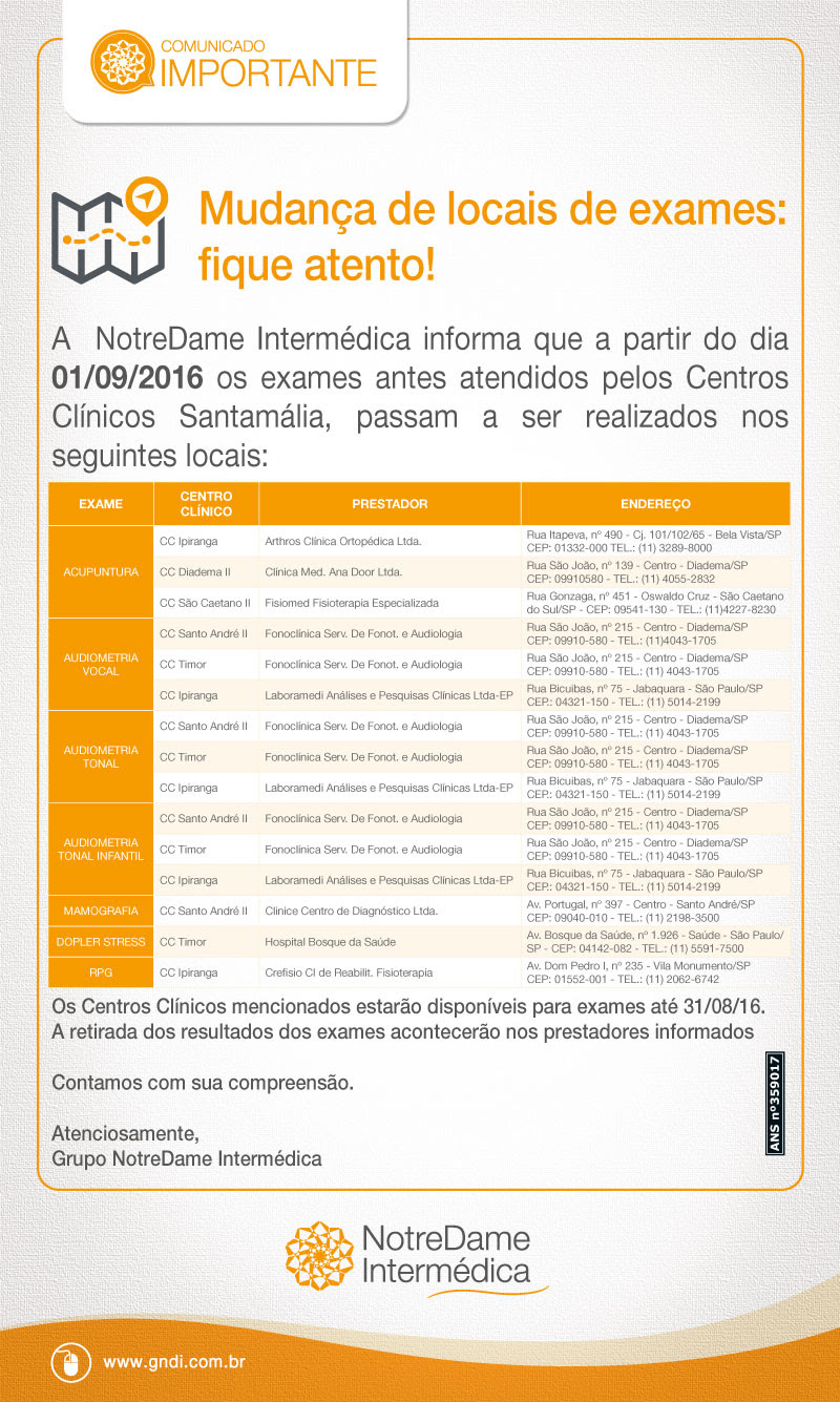 22/08/2016Comunicado NotreDame Intermédica Emei, Emi, Creche, Emef, Complementares - Comunicado 1227/2025> A NotreDame Intermédica informa que a partir do dia 01/09/2016 os exames antes atendidos pelos Centros Clínicos Santamália, passam a ser realizados conforme documento anexo. - Clique aqui para acessar o documento anexo - Mudança de locais de exames Quaisquer dúvidas, entrar em contato:Larissa Góes - 4233-7358
