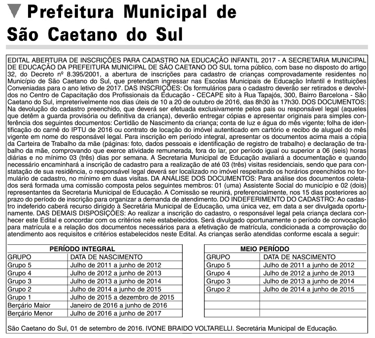 01/09/2016Abertura de inscrições - Educação Infantil 2017 Emei, Emi, Creche, Emef, Complementares - Comunicado 1237/2025> Segue Edital da abertura das inscrições para cadastro na Educação Infantil 2017. - Clique aqui para acessar o documento anexo - Quaisquer dúvidas, entrar em contato:Alunado Seeduc - 4232 7199