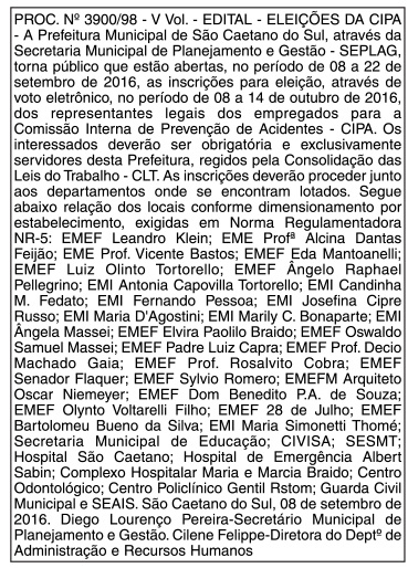 09/09/2016Edital Processo 3900/98 - Eleições CIPA Emei, Emi, Creche, Emef, Complementares - Comunicado 1244/2025> para conhecimento, segue Edital em anexo. - Clique aqui para acessar o documento anexo -
