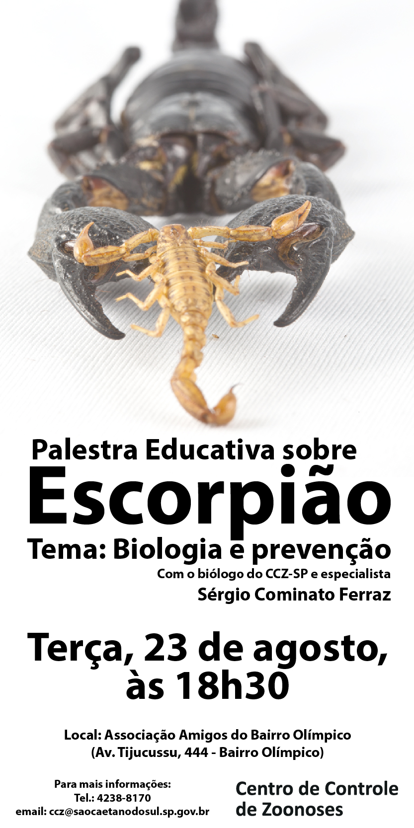 19/08/2016São Caetano promove Palestra Educativa sobre Escorpião Emei, Emi, Creche, Emef, Complementares - Comunicado 1226/2025> O Centro de Controle de Zoonoses (CCZ) da Secretaria de Saúde da Prefeitura de São Caetano do Sul promove gratuitamente nesta terça-feira (23/8), às 18h30, na Associação Amigos do Bairro Olímpico (Avenida Tijucussú, 444), a Palestra Educativa sobre Escorpião. Com o tema Biologia e prevenção, a apresentação aberta ao público será ministrada pelo biólogo do CCZ-SP e especialista Sérgio Cominato Ferraz. Mais informações podem ser obtidas por meio do telefone 4238-8170 ou do e-mail ccz@saocaetanodosul.sp.gov.br. Fernando Aragão (MTb. 40.308)(19/8/16) Crédito da arte: Divulgação/PMSCS - Clique aqui para acessar o documento anexo - Quaisquer dúvidas, entrar em contato:CCZ - 4238-8170 |