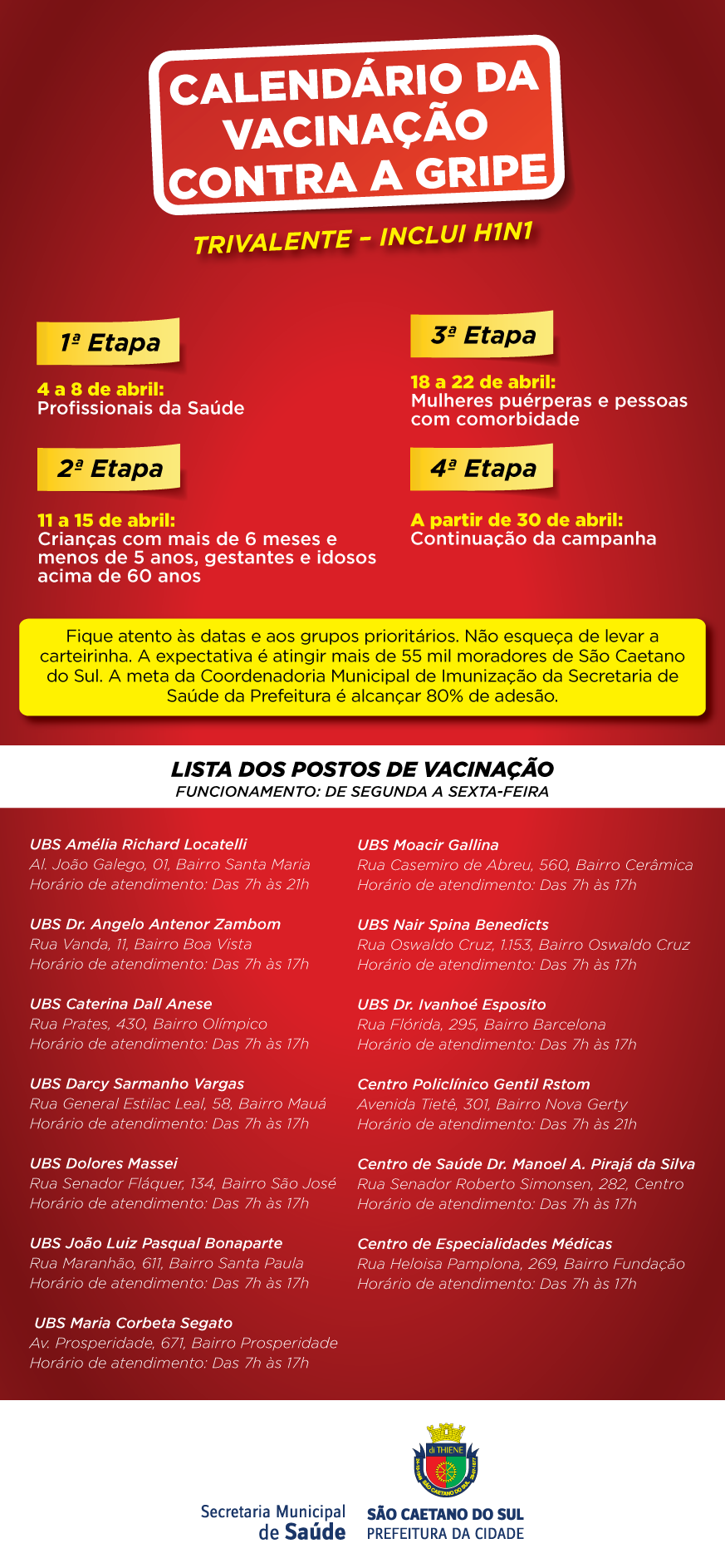 11/04/2016Calendário da Vacinação contra a Gripe Emei, Emi, Creche, Emef, Complementares - Comunicado 1152/2025> Segue calendário da vacinação contra a gripe em anexo. - Clique aqui para acessar o documento anexo - Quaisquer dúvidas, entrar em contato:Secretaria Municipal de Saúde - 4228-8800 e 4228-8000