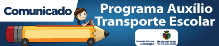 05/04/2016Edital - Programa Auxílio Transporte Escolar. Emei, Emi, Creche, Emef, Complementares - Comunicado 1146/2025> EDITAL – Profª Ivone Braido Voltarelli, Secretária Municipal de Educação da Prefeitura Municipal de São Caetano do Sul, COMUNICA a abertura de inscrições para estudantes interessados em concorrer ao Programa Auxílio Transporte Escolar. - Clique aqui para acessar o documento anexo - Edital - Programa Auxílio Transporte Escolar Quaisquer dúvidas, entrar em contato: Fabrício - Fone:42240691 -