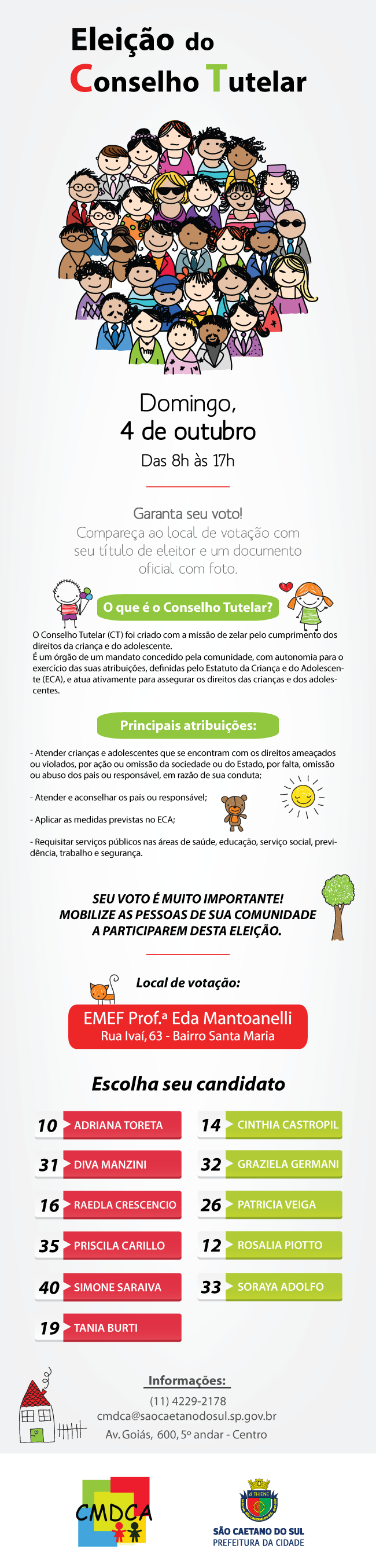 15/09/2015Eleição do Conselho Tutelar - 04/10 Emei, Emi, Creche, Emef, Complementares - Comunicado 966/2025> Segue convite para as eleições do conselho tutelar. EMEF Profª. Eda Mantoanelli Rua Ivaí, 63 - Bairro Santa Maria Dia: 04/10 Das 08h às 17h - Clique aqui para acessar o documento anexo