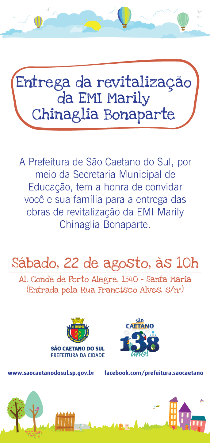 21/08/2015Entrega da revitalização da EMI Marily Chinaglia Bonaparte Emei, Emi, Creche, Emef, Complementares - Comunicado 938/2025> Senhoras Diretores, boa tarde! A Secretaria de Educação convida a todos para prestigiar a cerimônia de entrega da obra de revitalização da EMI “ Marily Chinaglia Bonaparte” - Local: Al. Conde de Porto Alegre, 1540 – Santa Maria (Entrada pela Rua Francisco Alves, s/n) - Data: Sábado - 22/08/15 - Horário: às 10h Agradecemos a participação!