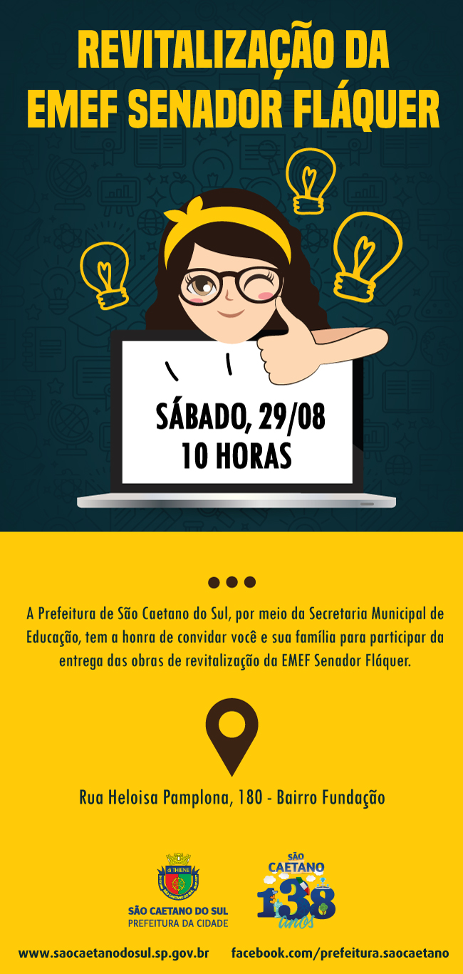 28/08/2015Revitalização EMEF Senador Fláquer Emei, Emi, Creche, Emef, Complementares - Comunicado 954/2025> Prezados(as) Diretores(as), boa tarde! A Secretaria de Educação convida a todos para prestigiar a cerimônia de entrega da obra de revitalização da EMEF "Senador Fláquer" - Local: Rua Heloísa Pamplona, 180 - Fundação - Data: Sábado - 29/08/15 - Horário: às 10h Agradecemos a participação!