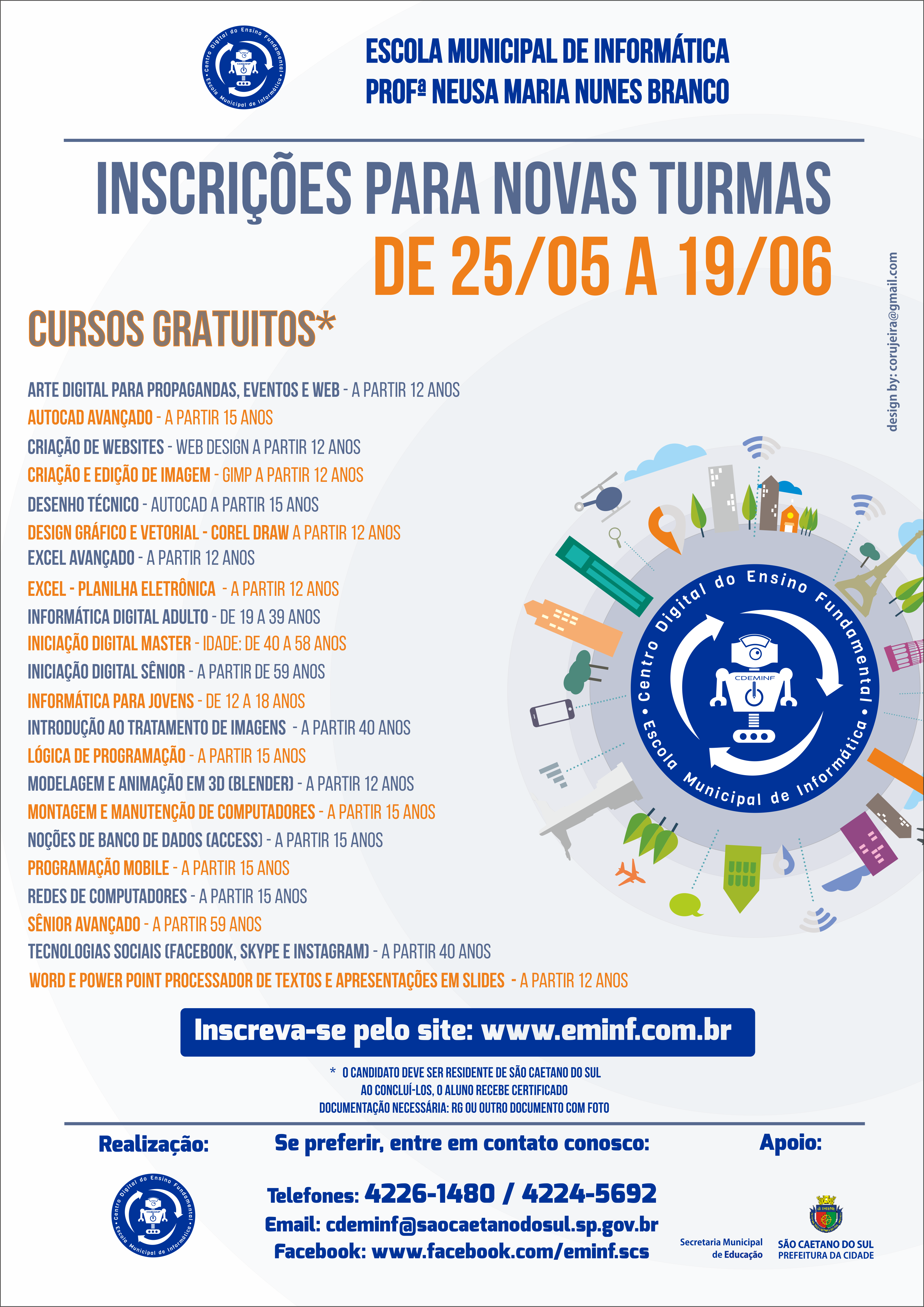 27/05/2015Escola de Informatica - Inscrições Abertas Emei, Emi, Creche, Emef, Complementares - Comunicado 858/2025> Inscrições Abertas até 19/06 Pelo site: www.eminf.com.br Pessoalmente: Av Goiás, 950 - Pç DiThiene Mais informações: 4226-1480 ou 4226-2245 Email: cdeminf@saocaetanodosul.sp.gov.br Conforme Edital do dia 22 de maio de 2015 - Diário do Grande ABC- Clique aqui para acessar o documento anexo Quaisquer dúvidas, entrar em contato:Jessica Alves - 42261480 - Clique aqui para acessar o documento anexo