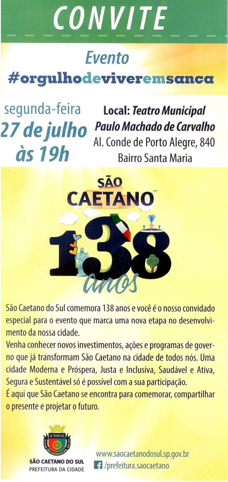 23/07/2015Convite - Aniversário de São Caetano Emei, Emi, Creche, Emef, Complementares - Comunicado 911/2025> Convite para o evento de comemoração dos 138 anos de São Caetano do Sul. #orgulhodeviveremsanca Imagem do convite