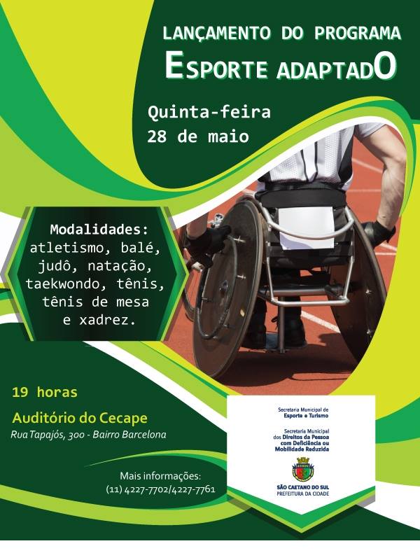 27/05/2015Programa Esporte Adaptado 28/05 Emei, Emi, Creche, Emef, Complementares - Comunicado 860/2025> A Prefeitura de São Caetano do Sul lança nesta quinta-feira (28/5), às 19h no Centro de Capacitação dos Profissionais da Educação (Cecape) Dra. Zilda Arns (Rua Tapajós, 300, Bairro Barcelona) o Programa Esporte Adaptado. Quaisquer dúvidas, entrar em contato:Secretaria de Esporte e Turismo - 4227-7702