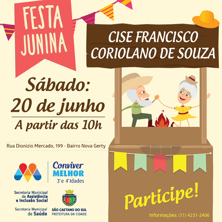19/06/2015Festa Junina dos CISEs - 19/06 à 04/07 Emei, Emi, Creche, Emef, Complementares - Comunicado 882/2025> Chegou a hora para os fãs de um dos eventos mais tradicionais do Brasil: as festas juninas e suas comidas típicas, danças e brincadeiras. A partir desta sexta-feira (19/6), os Centros Integrados de Saúde e Educação (CISEs) de São Caetano do Sul dão início às celebrações. Quem inicia os festejos é o CISE João Nicolau Braido (Rua Humberto de Campos, 600, Bairro São José). Com entrada gratuita a partir das 18h, nesta sexta, os participantes poderão desfrutar das delícias típicas da época, músicas e brincadeiras. Já no sábado (20/6), às 10h, é a vez do CISE Francisco Coriolano de Souza (Rua Dionízio Mercado, 199, Bairro Nova Gerty) promover o seu arraial. Programação – O CISE João Castaldelli (Av. Presidente Kennedy, 2400, Bairro Olímpico) realiza sua festa junina, na sexta-feira (26/6), a partir das 15h. Encerrando a festança, o CISE Moacyr Rodrigues (Rua Rafael Corrêa Sampaio, 600, Bairro Santa Paula) faz a sua festa julina no sábado (4/7), a partir do meio-dia.