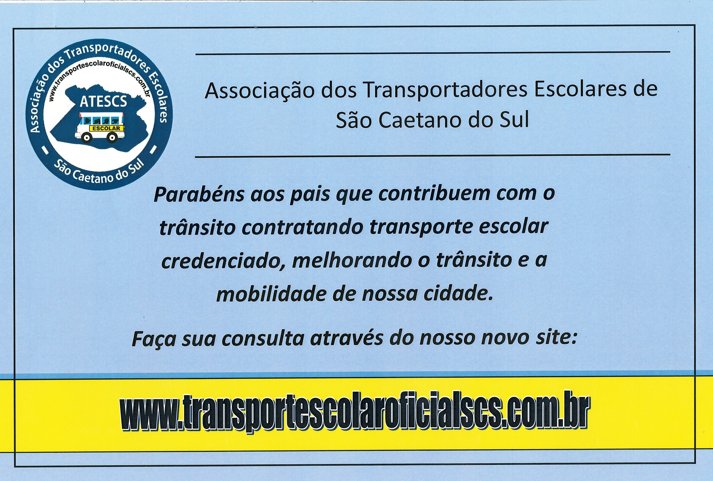 03/10/2018Agradecimento aos contratantes do transporte escolar credenciado Emei, Emi, Creche, Emef, Complementares - Comunicado 1895/2025> Segue nota de agradecimento da Associação dos Transportadores de São Caetano do Sul. Solicitamos aos diretores que coloquem o documento no mural de informações da entrada da escola. Atenciosamente - Clique aqui para acessar o documento anexo