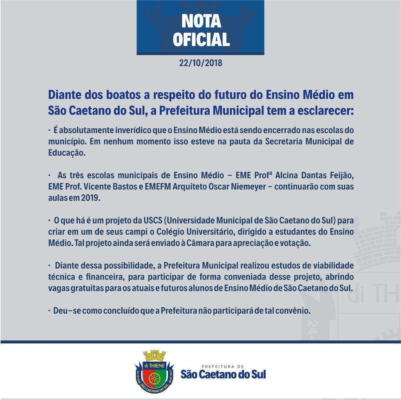 22/10/2018Nota Esclarecimento - Ensino Médio Municipal Emei, Emi, Creche, Emef, Complementares - Comunicado 1924/2025> Nota de Oficial para esclarecimento referente ao Ensino Médio Municipal. Favor divulgar. - Clique aqui para acessar a nota em anexo