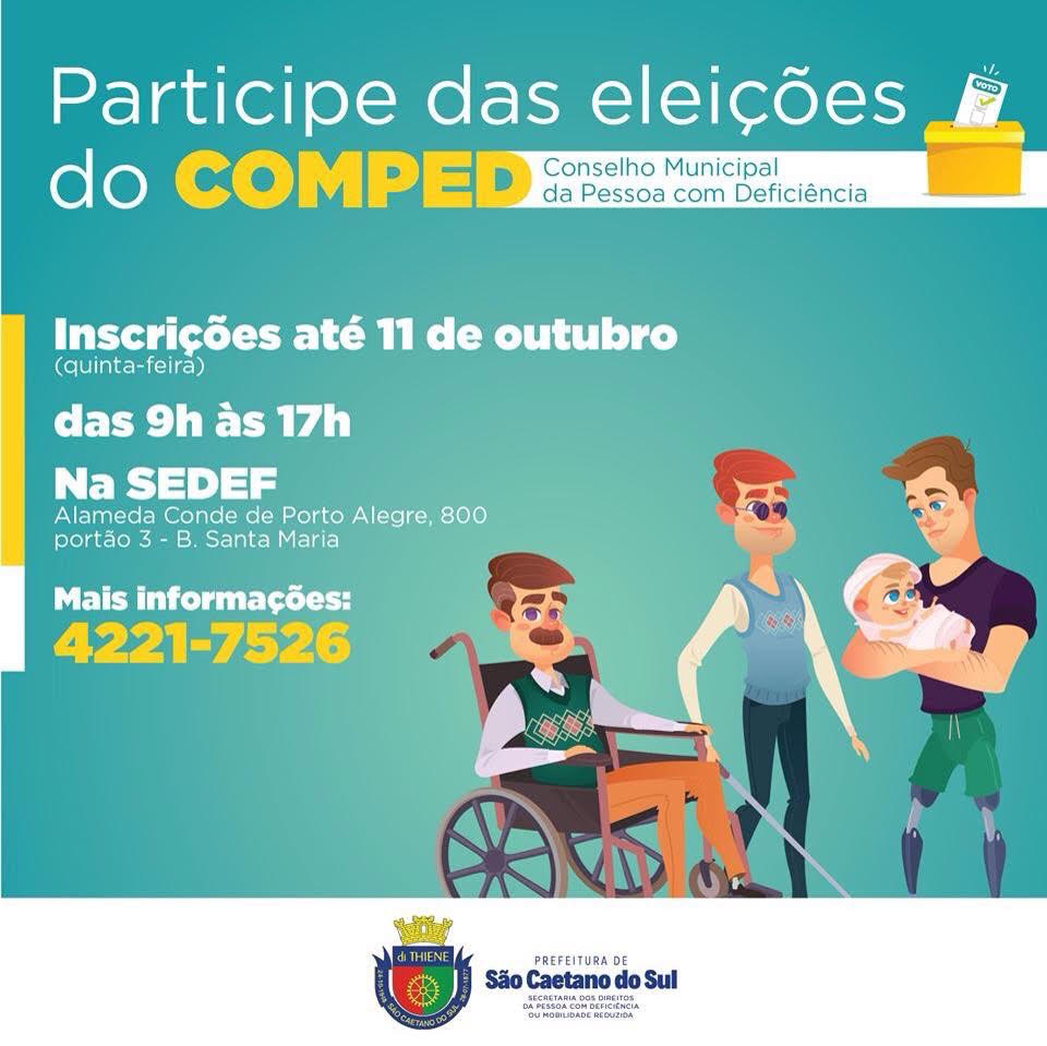 11/10/2018COMPED Emei, Emi, Creche, Emef, Complementares - Comunicado 1907/2025> Conselho Municipal da Pessoa com Deficiência A Prefeitura convida os munícipes para participarem do processo eleitoral do Conselho Municipal da Pessoa com Deficiência(COMPED), como representantes da sociedade civil interessados em concorrer a uma vaga no órgão ou como eleitores. As inscrições podem ser feitas pessoalmente na SEDEF, Alameda Conde de Porto Alegre, 800, das 9h às 17, até o dia 11 de outubro. Maiores informações 4221-7526. Solicitamos divulgar entre os servidores. Quaisquer dúvidas, entrar em contato:Adriana Maria Putini Assi - 42327199