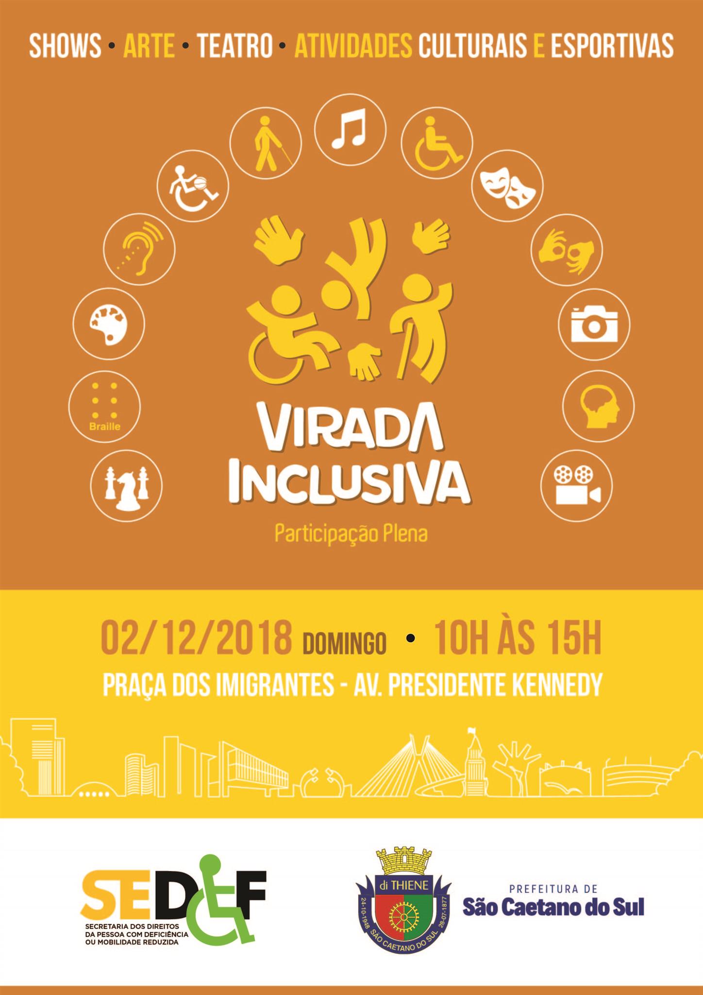 01/10/2018Convite - Emei, Emi, Creche, Emef, Complementares - Comunicado 1892/2025> A SEDEF comunica que São Caetano do Sul participará da 9ª edição da "Virada Inclusiva" - Participação Plena. Em virtude do grande êxito na edição anterior, convida as escolas a participarem da grade de programação. Data: 02/12/0218 Local: Praça dos Imigrantes, Avenida Presidente Kennedy Horário: das 10h às 15h Por que participar da VIRADA INCLUSIVA? "Porque além de celebrar o DIA INTERNACIONAL DA PESSOA COM DEFICIÊNCIA, o evento possibilita que todos, pessoas com e sem deficiência, possam estar juntos em ações inclusivas. O Dia Internacional da Pessoa com Deficiência é celebrado no dia 03 de dezembro, data muito importante na história da inclusão da pessoa com deficiência." Para as escolas interessadas em participar, enviar intenção/atração até 30/10/2018, para o e-mail: sedef@saocaetanodosul.sp.gov.br ou através do telefone 4221-7526 - falar com Ana Paula, Fernanda ou Luciana. Quaisquer dúvidas, entrar em contato:Carla - 4232-7199